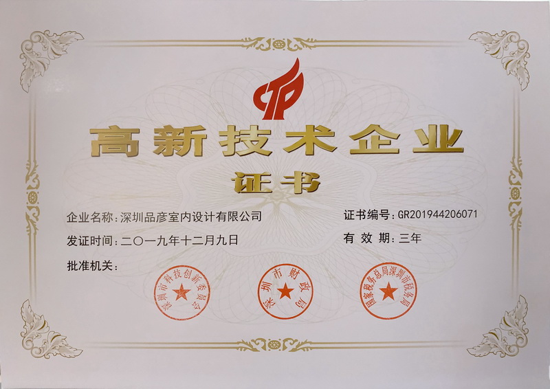 近日,深圳品彥室內(nèi)設(shè)計(jì)有限公司榮獲深圳市科技創(chuàng)新委員會(huì)、深圳市財(cái)政局、國家稅務(wù)總局深圳市稅務(wù)局聯(lián)合頒發(fā)的“高新技術(shù)企業(yè)”認(rèn)定證書。