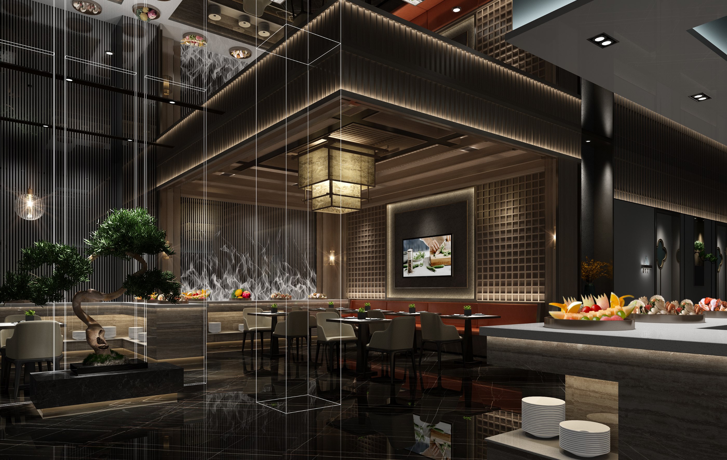 在自助就餐區(qū)域,設計師用木質建材的交錯堆疊構建出中式傳統(tǒng)設計中的方井套疊藻井,中央處懸掛的華雅古韻紗布宮燈和仿制格柵門設計的墻面裝飾,以及一旁遒勁獨立的蒼綠古松,幾者共同營造出一個大氣典雅的中式就餐環(huán)境。