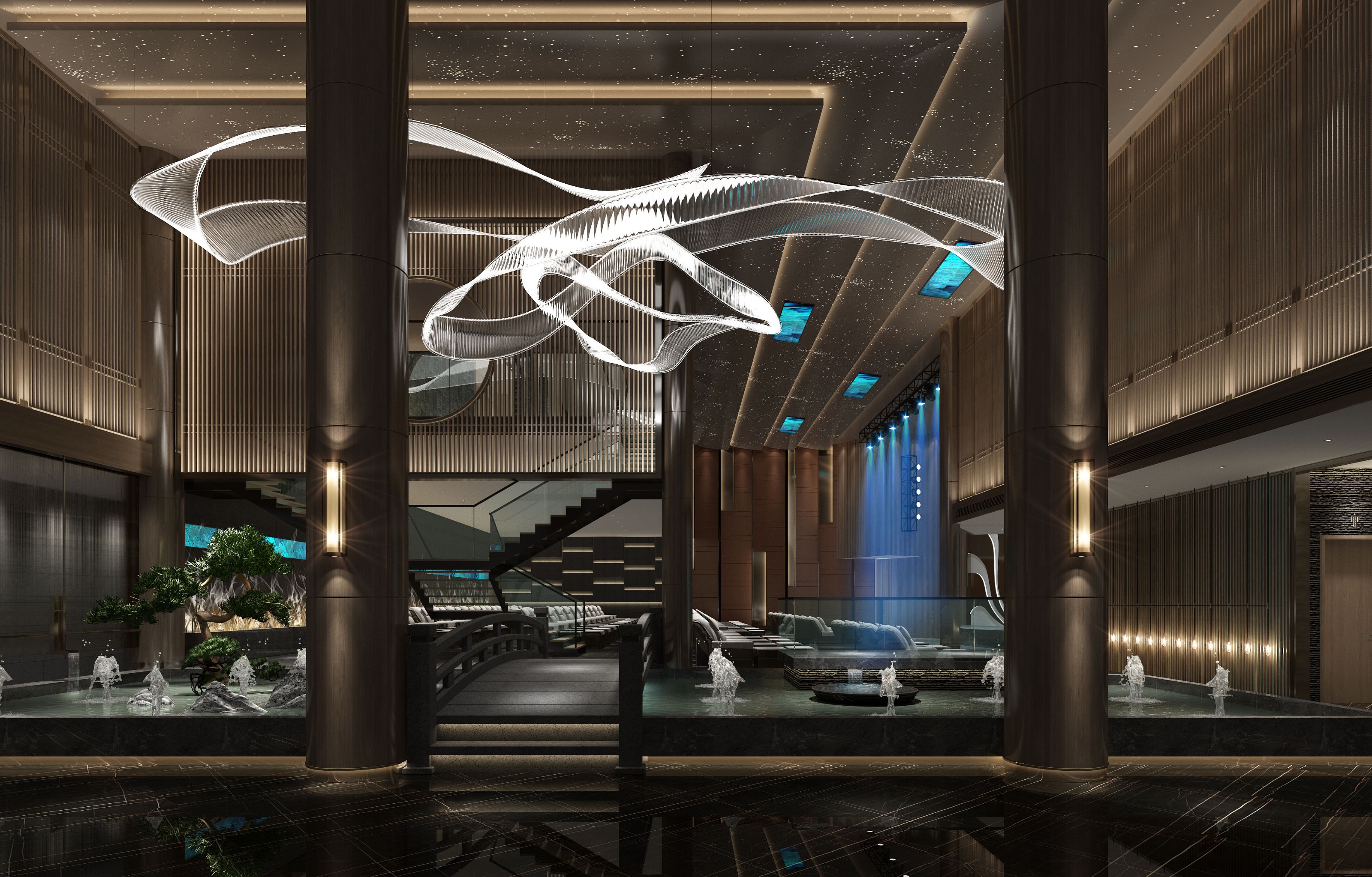 足浴休息大廳,整齊排列的寬大米白色柔軟足浴椅給人以舒適對稱的視覺美感,低調內斂中帶著幾分華貴氣息。旁邊觀賞區(qū)設計采用小橋流水人家概念,用一方古色古香的木質中式橋梁取締了尋常的過道設計,小橋兩邊繼續(xù)延伸中式韻味,用山石、流水、蒼松,描繪一幅浩渺的山水畫卷,其上吊燈設計同樣獨具韻味、飄逸隨形,好似隨風飄揚的彩帶,又似變化不定的白云。天與云與山與水,上下一白。