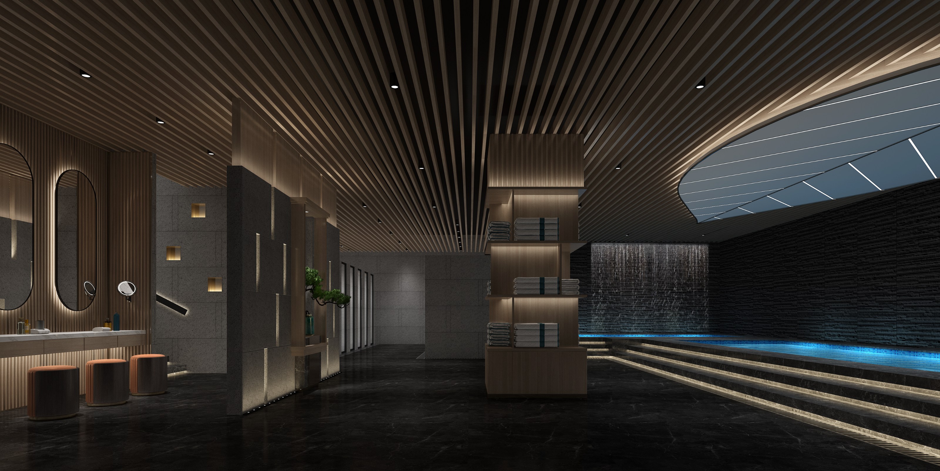水療區(qū)作為整個水療會所最重要的功能分區(qū),其裝修設計最能體現(xiàn)整座水療會所的格調。設計師用規(guī)整的裝修設計以及大面積的留白處理,讓整個水療區(qū)盡顯磅礴大氣。隨處可見的木質裝飾和遒然勁松迎合了會所主體的淡雅設計,讓消費者從大堂踏入水療區(qū)時不會產生割裂感。在水池區(qū)域,一片偌大的葉子造型燈牌懸掛在吊頂之上,配合一旁流淌著淅瀝水流的墻壁,讓消費者有親近大自然的松弛之感。