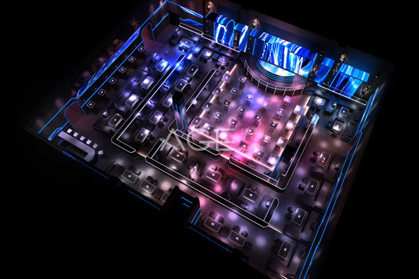 整個酒吧格局方正,從內(nèi)到位的區(qū)域劃分由中心舞臺以正方形的形狀向外擴充,整齊規(guī)范,燈光也由中心明亮多彩漸漸轉(zhuǎn)弱,給人從激情到放松的絕佳體驗。酒吧的內(nèi)部空間是設(shè)計師打造的重點區(qū)域。前廳區(qū)域,一盞盞穿透力極強的小射燈準確無誤地投影在對應(yīng)的位置上,讓每一位客人都有屬于自己的主角光環(huán)。頂部采用大片流動性的藍色燈區(qū),四周的藍色線條燈帶與之呼應(yīng),瞬息萬變的燈光可以從一個安靜的少女變成魅力四射的狂野女郎,四面八方投射出五光十色的光影,氣氛燃爆全場。每張桌子用明亮的線條勾勒出本身的形狀,貼心的設(shè)計是為了讓每一位客人都能輕松找到自己的專屬座位。