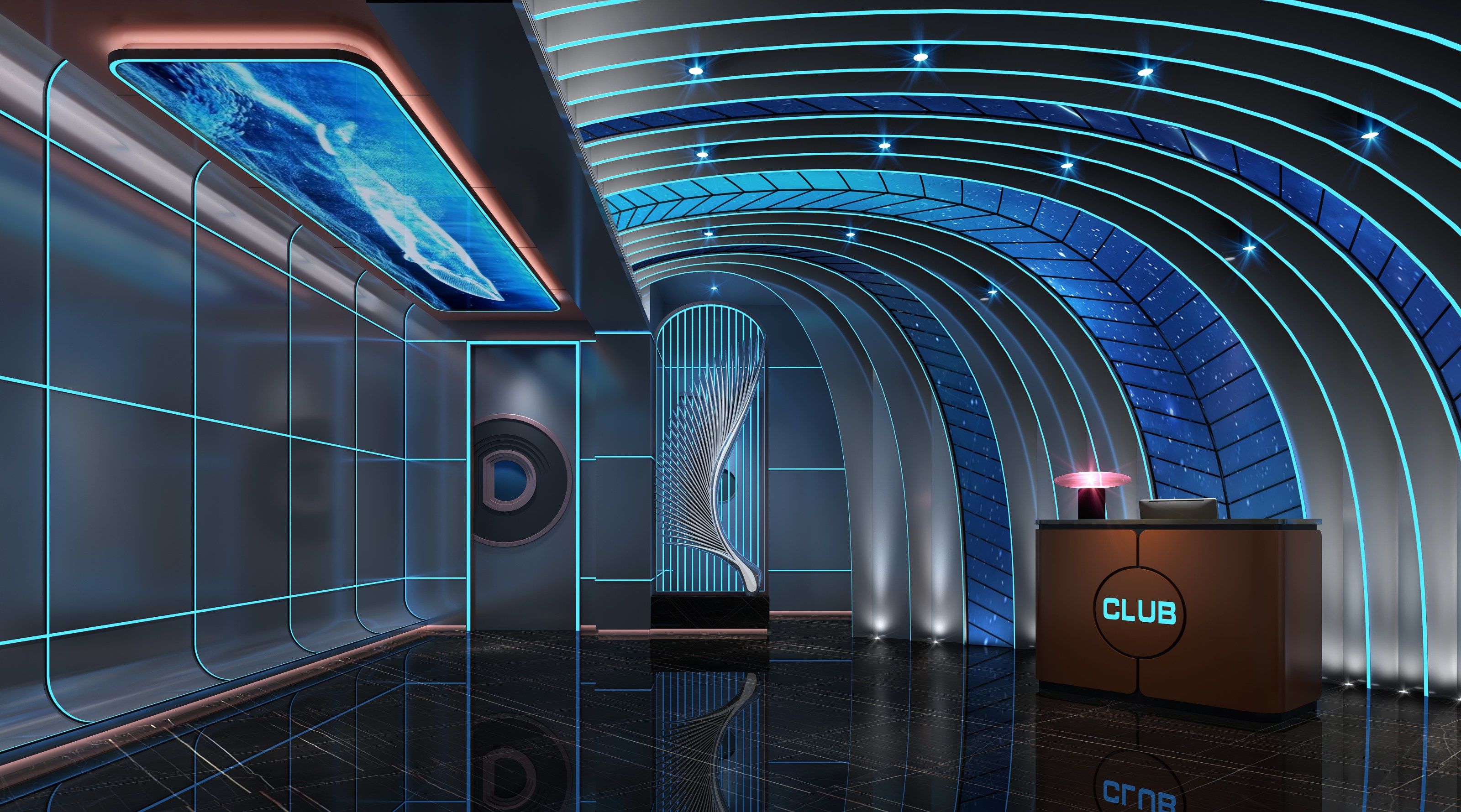 派對房設(shè)計采用大片不規(guī)則熒幕搭配上大面積藍(lán)白燈帶、金屬質(zhì)感銀色建材,將其打造成一個位處海底世界之中的藍(lán)色奇幻空間。通過派對房內(nèi)音樂燈光和熒幕上海底之景的變幻,讓消費者的全部感官在不知不覺間全方位地沉浸在設(shè)計師精心布置出來的海底世界中。