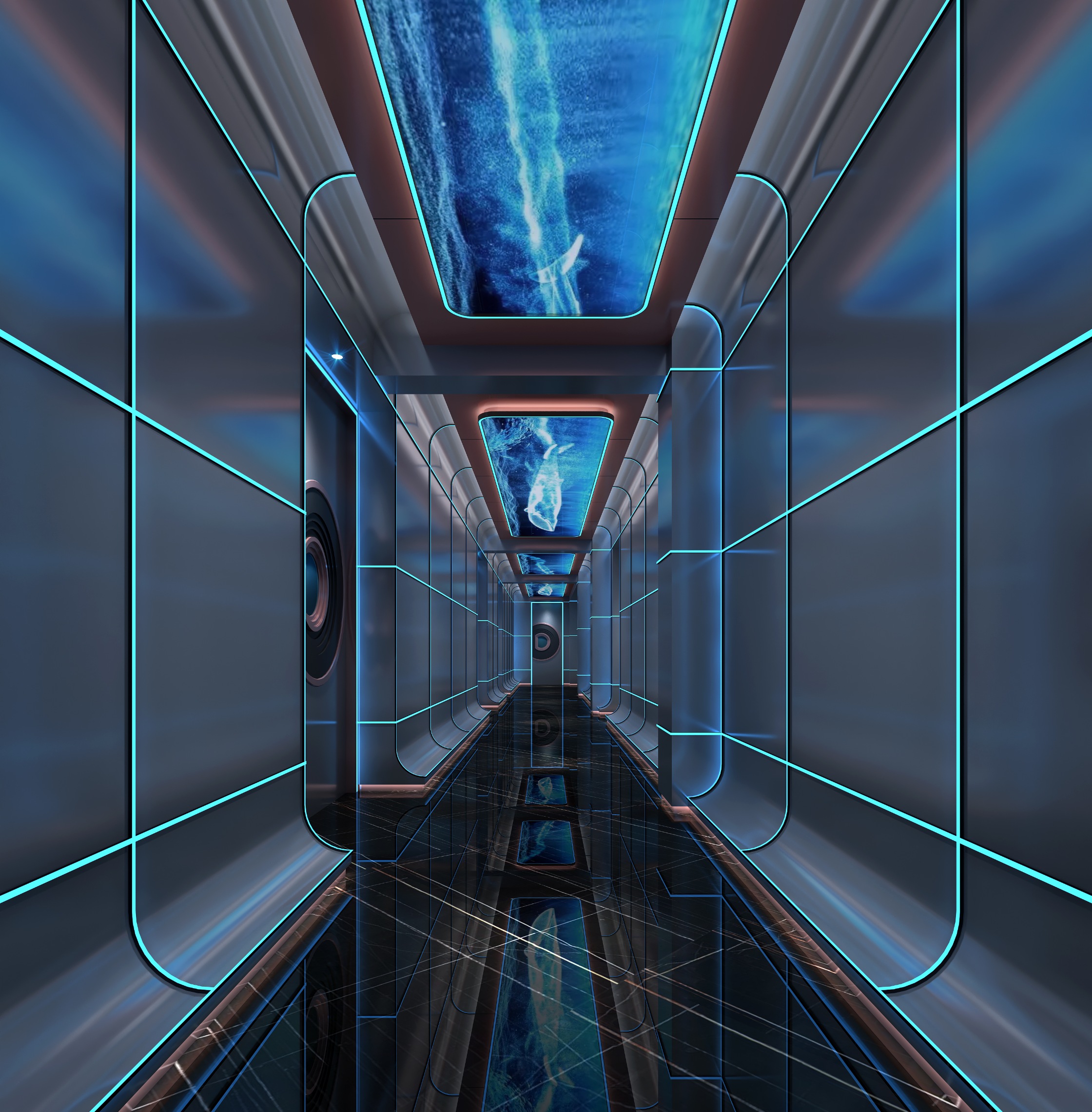 走道設(shè)計依舊延續(xù)前臺接待區(qū)風(fēng)格,兩側(cè)墻面用平整圓滑的銀色金屬色澤建材作為鋪墊,其上布滿排列有序的藍(lán)色燈帶,吊頂?shù)拿總€間隔區(qū)域均采用一整塊凸顯海底天然景觀的燈牌,用這種擠滿眼部視線的方式讓消費者沉浸在由設(shè)計師一手構(gòu)建出的海底世界中。地面設(shè)計選擇光滑的大理石板,能最大程度的映射墻壁燈光和吊頂燈牌景色,讓整個走道空間更加和諧統(tǒng)一,融為一體。