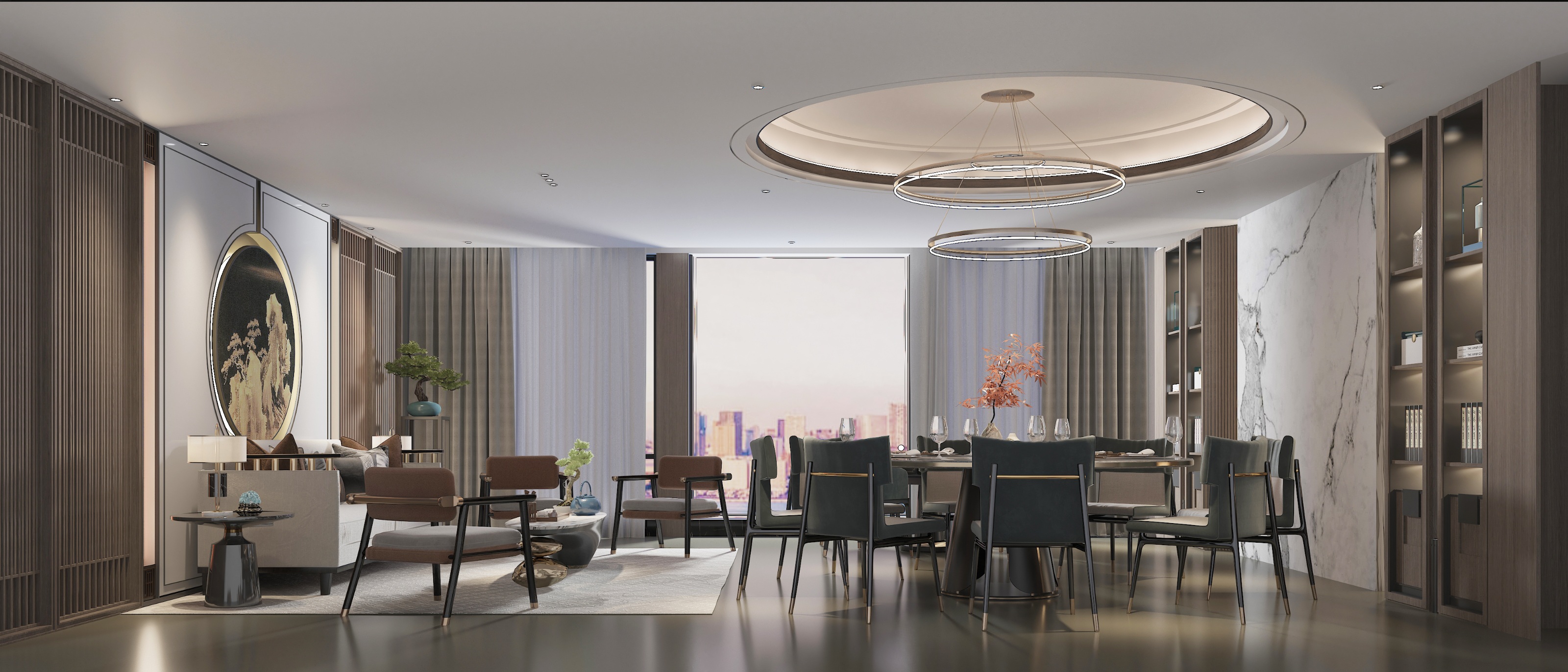 走廊過道設計以寬闊平整彰顯大氣,整體裝修色調(diào)以米白色搭配木色營造溫馨淡雅氛圍。走道兩側(cè)墻面裝飾,設計師采用梅花漏窗這一蘇式園林建筑中獨具韻味的設計元素,結(jié)合水墨山水畫卷和精致小巧的微縮八角亭,將開闊寧靜和古韻綿長完美帶入到走廊過道的整體設計中。