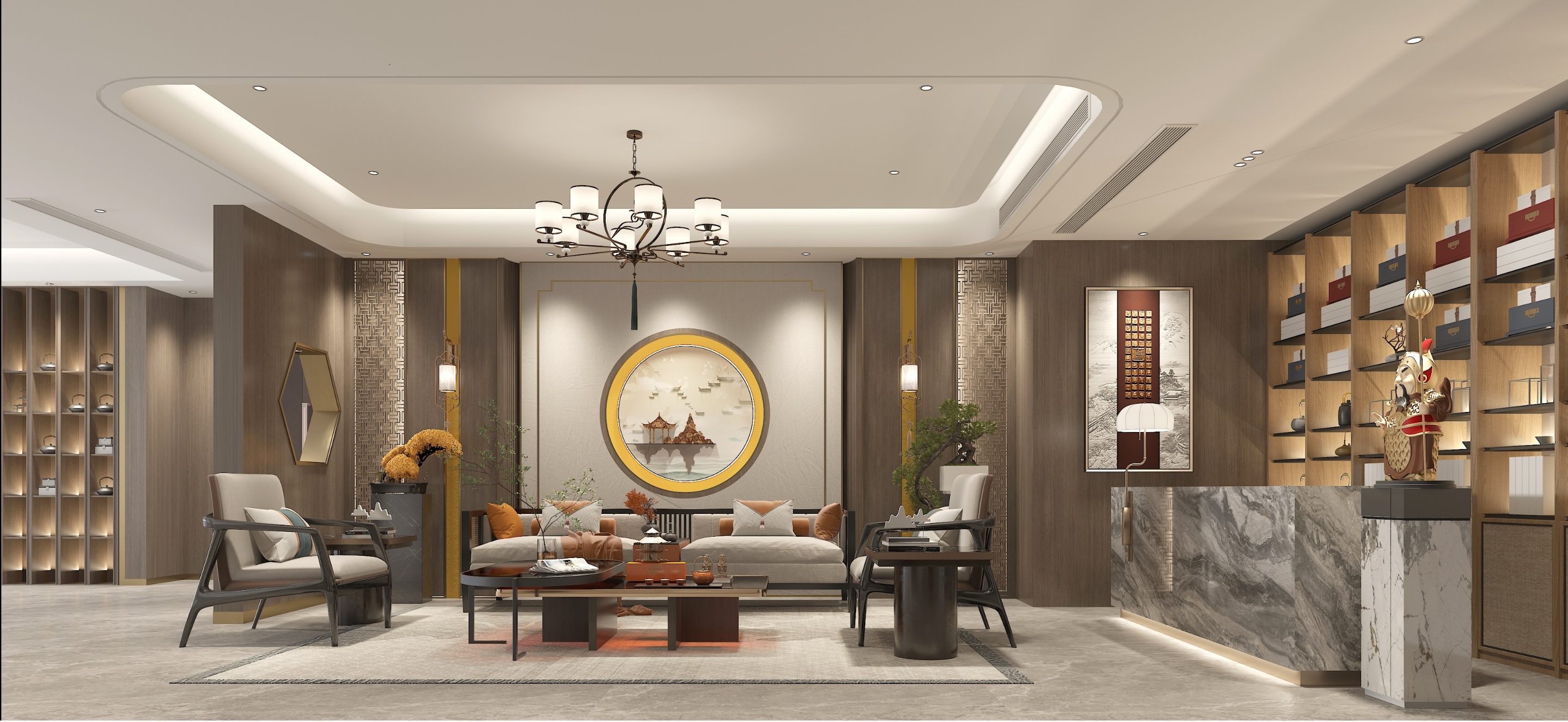 前臺大廳作為接待消費者的第一道門戶,其裝修設計會直接影響消費者對于茶室的整體觀感。因此在本案前臺大廳的設計上,設計師采用現(xiàn)代極簡風格搭配細節(jié)處的中式經(jīng)典元素,像姿態(tài)各異的盆栽、清新淡雅的古韻壁畫、經(jīng)典窗欞紋路和古典宮燈等等,讓整個前臺大廳呈現(xiàn)出一種高端淡雅氣質(zhì)的同時,也飽含東方文化底蘊。除此,設計師還別出心裁的在前臺工作區(qū)域上放置了一尊Q版中國古代大將軍像,為整個前臺大廳的裝修設計添上一抹亮色和趣味。