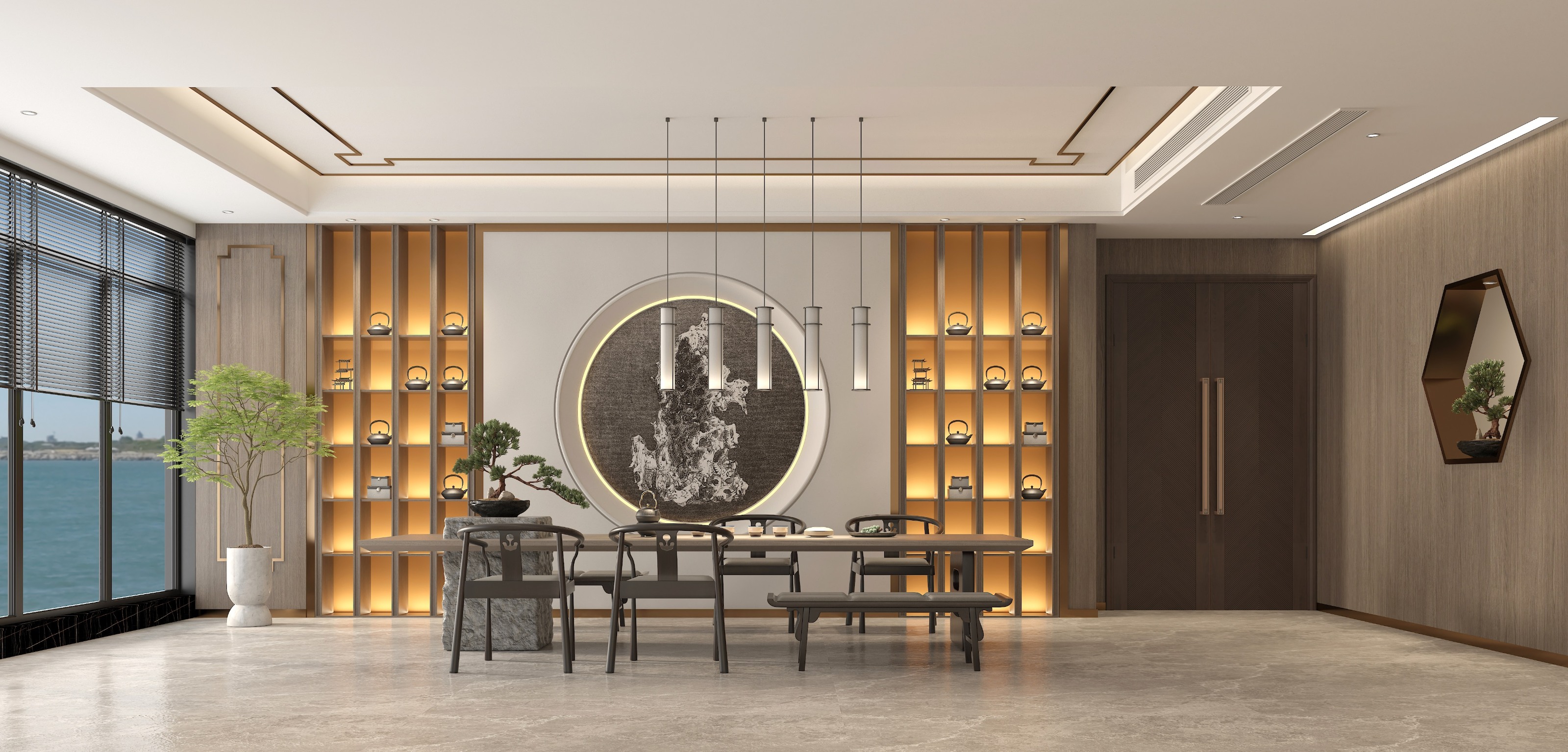 茶區(qū)作為整個茶室最為重要的功能分區(qū),其裝修設計必須迎合消費者的心境所需。除了必要的開闊視野和寬敞的物理空間讓消費者從身體觀感上感到順暢外,還需要用充滿意蘊的設計讓消費者的精神靈魂得到升華。在這方面,設計師因地制宜,用多面落地窗將室外的風景投射到室內(nèi),提升視野開闊感和靈魂延伸感。在室內(nèi)裝修設計上,設計師用山水樹木擺件烘托自然氛圍,用自然寧靜讓消費者心神平和。