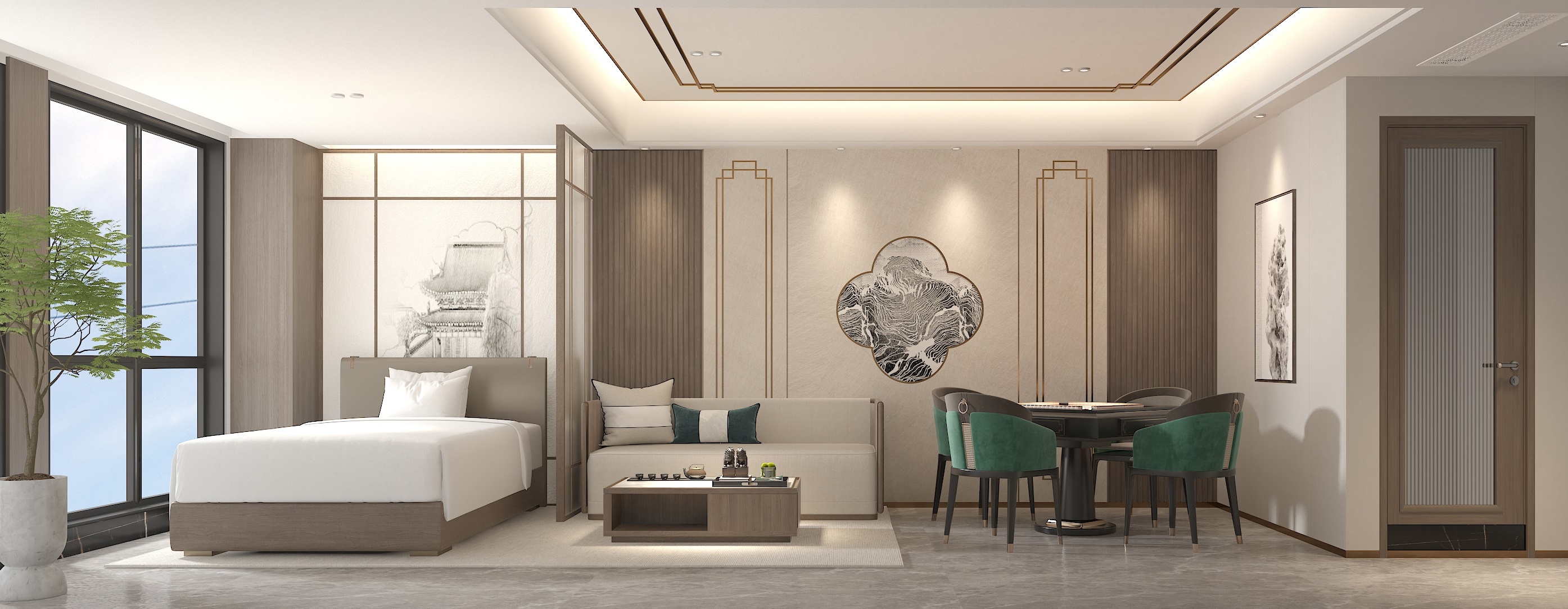 各式包房因?qū)嶋H用途和規(guī)劃不同,所以設計師在面對不同包房時作出的設計,在保證各式包房的基礎功能外,還要融合各種和而不同的設計元素,避免整體包房設計過于單一枯燥。包房設計上,設計師延續(xù)極簡設計帶來的空間寬敞感,再用木色、白色等輕色調(diào)營造清新淡雅氛圍。同時用格柵、山水畫軸、屏風等中式古韻元素提升整體裝修設計的文化韻味。