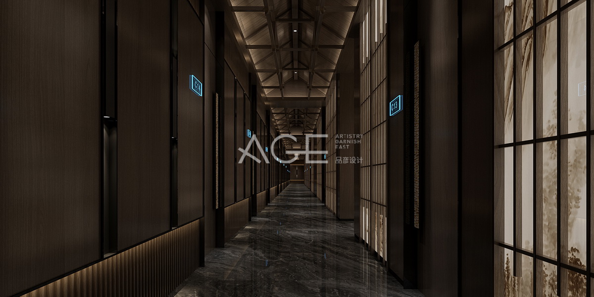 走廊整體設計彰顯出一種輕奢大氣的現代簡約風格,方形與線條搭配有序,棕、灰、黑三色基調,擋不住的高貴直接映入眼簾,漂亮的條紋大理石地板與凹造型木條元素的天花板形成相呼應設計,通道兩邊的墻體設計各顯千秋,都有方格和線條的元素,又獨行特立。