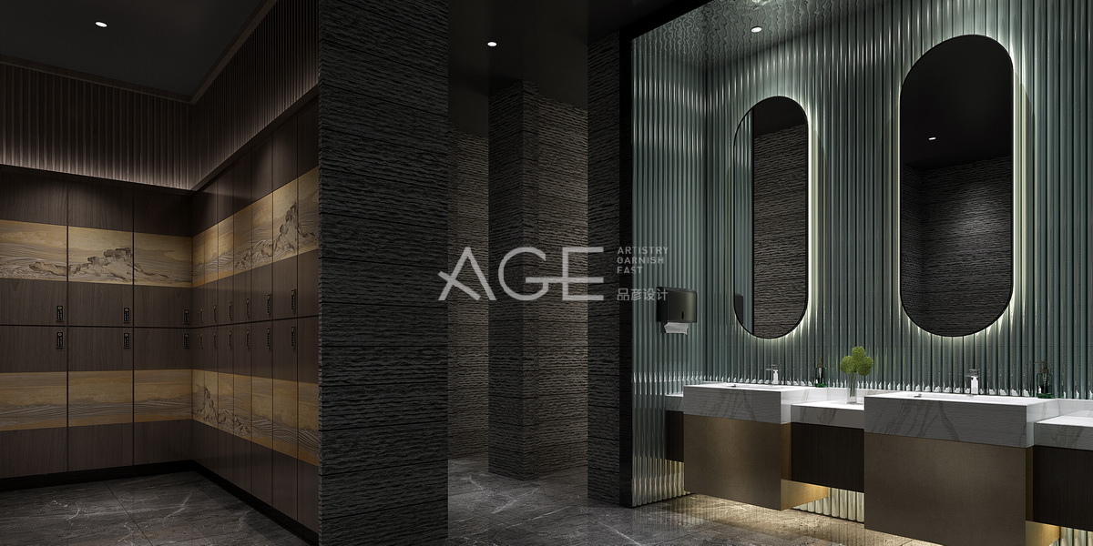 更衣室整體設計現代簡約+新古典風格,盡顯懷舊、貴氣、大氣和隨意的風采,又形成獨有的空間感,灰、棕的基調,用金黃與白點綴出輕奢之氣。更衣區(qū)域自成一派,更衣柜上下各有一體的山水畫圖案,柜頂設計條紋與衣柜形成別樣的新古典氣場。梳洗臺設計采用玻璃質感的墻體和下面的金黃底、白色的面盆,用燈光照耀更顯層次感。墻體采用橫紋大理石無形中讓衛(wèi)生區(qū)域顯得有檔次,整體區(qū)域采用花紋大理石地板,點綴著更衣室的層次感。