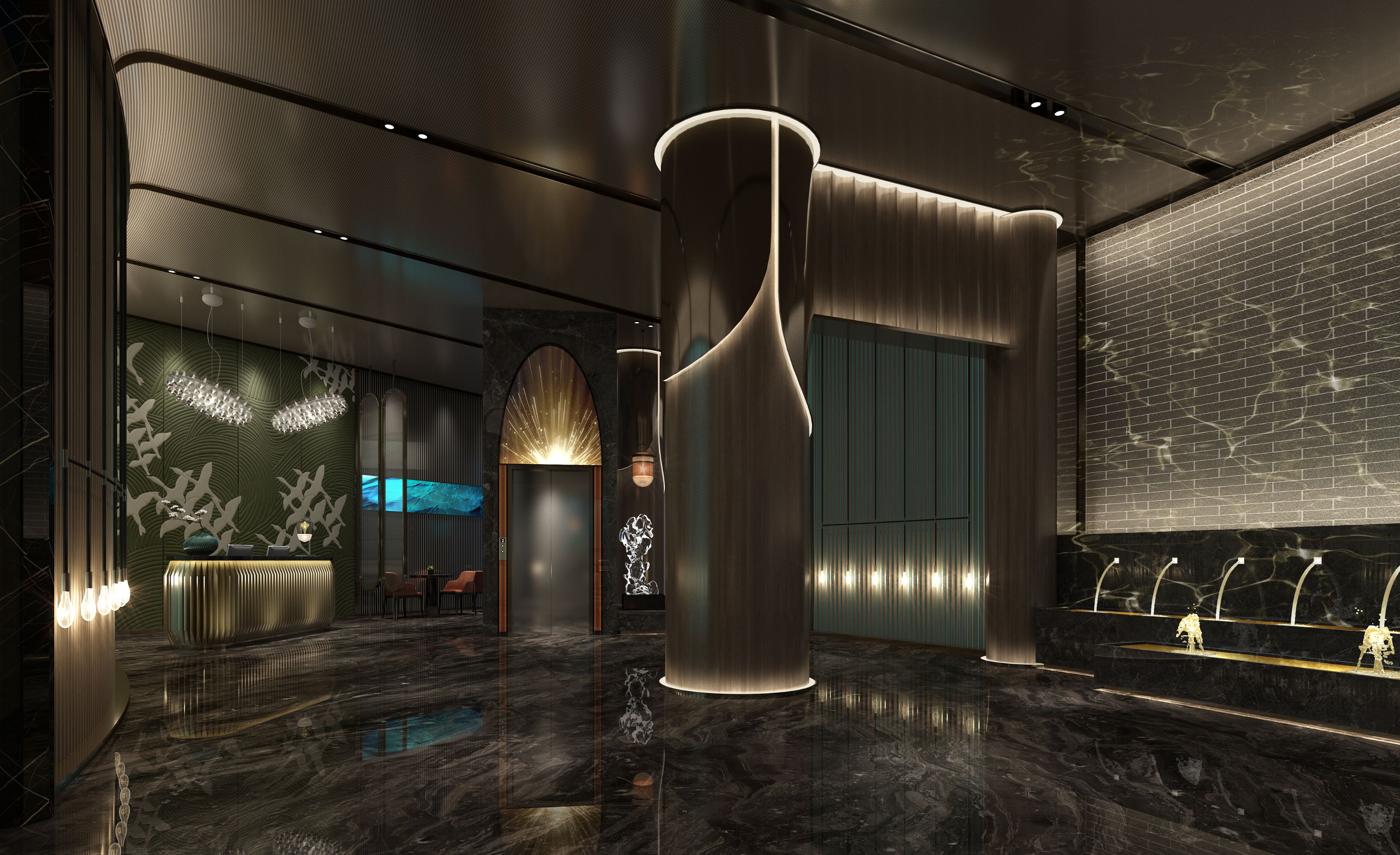 大堂設(shè)計獨具匠心,新式燈光設(shè)計改變了傳統(tǒng)放置高度,減少了強光直射對于消費者視覺的強硬沖擊,在保證照明需求的同時營造出一個柔和溫暖的光照環(huán)境。一方墻壁波光粼粼的設(shè)計,配合下方潺潺流出的純凈水柱,用舒緩的流水聲和復(fù)古的磚墻紋路,讓消費者的思緒陷入安寧的舊日時光。一旁,設(shè)計師用簡化的蟬翼代表夏蟬,將突兀的承重圓柱意象成一根棲息著夏蟬的挺拔樹枝,增添自然意味。前臺設(shè)計進一步深化自然概念,用綠色浮刻曲紋背景板象征綠色田野,與振翅飛過的大雁勾勒出一幅歲月靜好的鄉(xiāng)野畫面,燈飾設(shè)計采用蓮蓬造型,讓吊燈與天野背景相互呼應(yīng),增強一體性觀感。