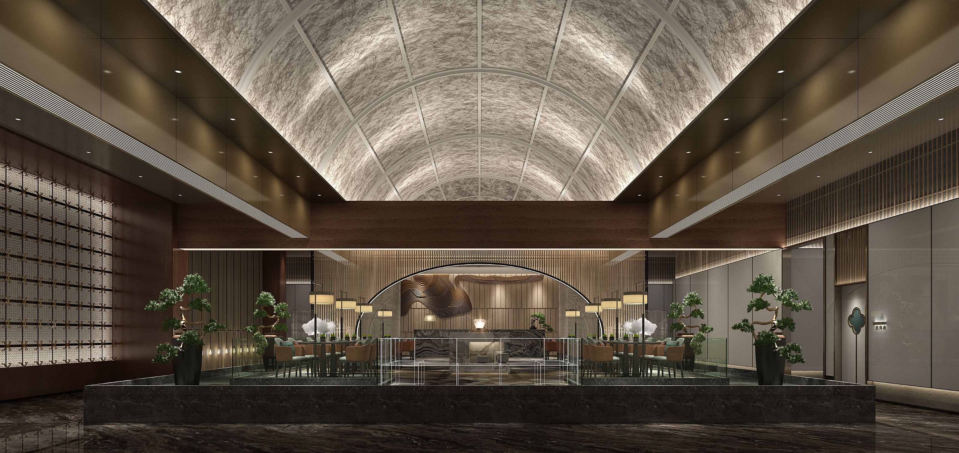 自助餐廳采用與自然最為和諧共生的中式園林設(shè)計,通過格柵、圓拱門、流水、蒼松等特色元素,將一方用餐空間描繪得真如古色古香的古韻中式庭院。正面墻面設(shè)計,用原木雕刻而成的愜意流云盡顯自然安寧姿態(tài)。高高拱起的圓弧吊頂設(shè)計突破平面限制,帶給消費者磅礴大氣和超脫桎梏的遐想。